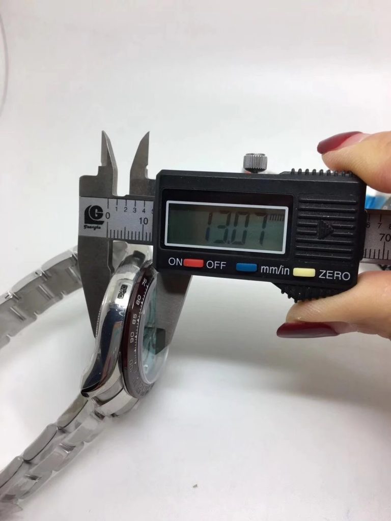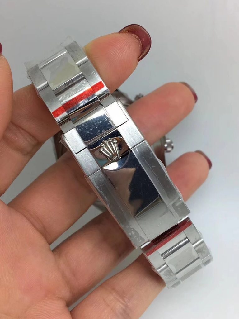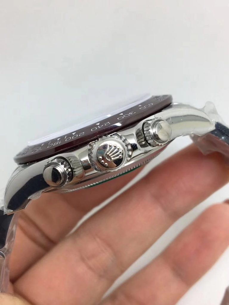 NOOB工場のディトナ116506 スーパークローンは、ケース直径40mm、厚さ12.5mmと本物に忠実再現しました。ケースは316Lステンレススチール製で、ラグ部分はポリッシュ仕上げ、他の部分はブラッシュ加工を施し、高級感を演出しています。ブラウンセラミックベゼルには白いタキメータースケールが刻印され、視認性が高いです。サファイアクリスタルは厚みがあり、ベゼルからの高さが本物同等です。特定の角度から見ると、6時位置に小さなロレックスクラウンが浮かび上がる点も再現されています。このような細部へのこだわりが、NOOB工場のロレックス スーパークローンを市場トップに押し上げています。